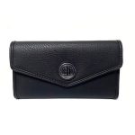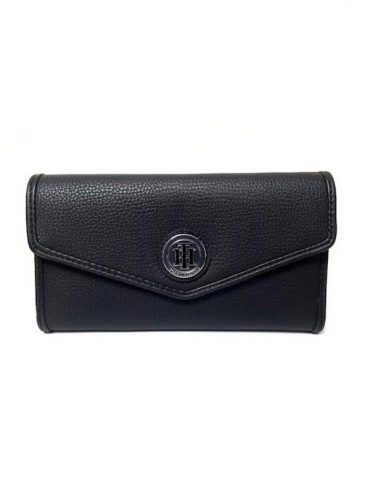 Billetera de 2 cuerpos negra con tapa y placa con logo plateado TH, monedero con cierre en la parte posterior