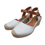 Alpargatas con taco tipo cuña en color vainilla con correa en color camel. Talla: 7.5 (38)