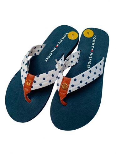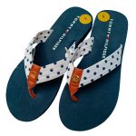 Sandalias de suela EVA tipo tijera con tela blanca y circulos azules. Talla: 38