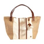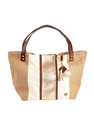 Materiales: Combinación de laterales en yute natural y tela, centro y asas en cuero genuino, ornamentos importados, pasamanería de acabado premium y forro interno de taslán impermeable.