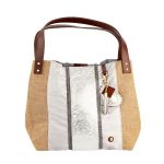 Materiales: Combinación de laterales en yute natural y tela, centro y asas en cuero genuino, ornamentos importados, pasamanería de acabado premium y forro interno de taslán impermeable.