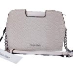 Cartera de hombro color crema con monograma en alto relieve.