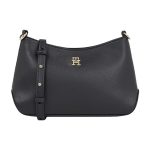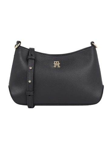 Crossbody de hombro Tommy Hilfiger en cuero negro granulado con logotipo dorado minimalista y correa ajustable.