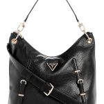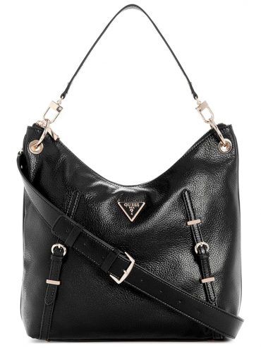 Bolso hobo Guess en cuero negro granulado con múltiples correas, herrajes dorados y el clásico logo triangular