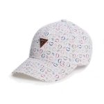 Gorra blanca marca Guess con diseño de monograma multicolor y logotipo triangular metálico.