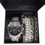 Moderno set para hombre compuesto por un reloj de pulsera metálico con cronógrafos decorativos y dial oscuro, acompañado de 3 esclavas de eslabones tipo cadena a juego.