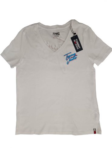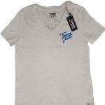 Polo blanco cuello V de dama con letras en color turqueza. Talla M