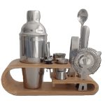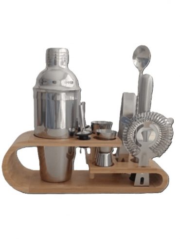 Set de Bar 11 componentes de acero pulido, mezclador con capacidad de 750 ml. Base de madera elegante y moderna.