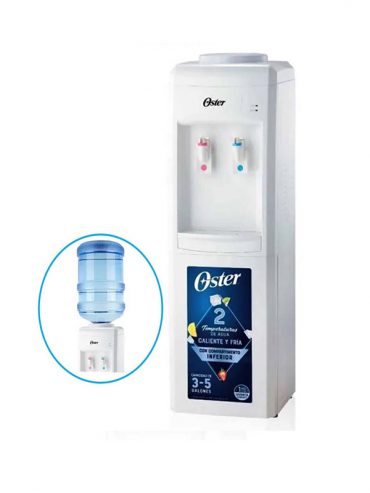Dispensador de agua de piso Oster cuenta con una capacidad de 20 litros soporta de 3 a 5 galones, tiene dos salidas de agua caliente y fría, una bandeja de goteo extraíble, bloqueo de seguridad para niños, funcionamiento silencioso mas un compartimiento.