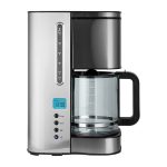 Cafetera eléctrica automática, jarra de vidrio para 12 tazas de café, sistema anti-goteo, filtro de nylon, 900 watts, color negro con aplicaciones de acero inoxidable.