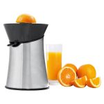 Exprimidor de cítricos, potente motor de 85 watts, caño para llenado directo al vaso con sistema anti goteo, cuerpo de acero inoxidable.