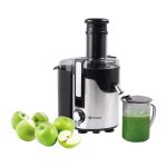 Extractor de fruta completa, potente motor de 850 watts para un máximo rendimiento de extracción de hasta 65%, boquilla de ingreso de 75mm. para fruta completa, dos velocidades, jarra recipiente 800 ml., amplio contenedor para pulpa, cuerpo de acero inoxidable.
