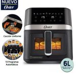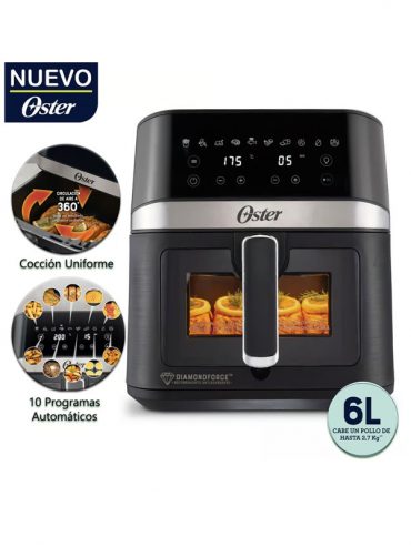 Recubrimiento Oster® DiamondForce: Hasta 15 veces más fácil de limpiar*.Hasta 12 veces más resistente a rayaduras*: No se agrieta, pela o raya6L de capacidad: permite cocinar un pollo de hasta 2.7KgPanel de Control DigitalVentana y luz Interna para mejorar la visibilidad y controlar la cocción de los alimentos10 Programas Automáticos que añaden conveniencia y facilidad al cocinar: Papas fritas, alitas, aves, carne, vegetales, pescado/mariscos, hornear, postre, deshidratar, calentarCocina hasta con 99% menos aceite***Sistema de manejo de cables: Mantiene el cable ordenado y listo para usar