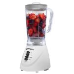 Licuadora con vaso de plástico de 1.25 litros de capacidad, 2 velocidades + pulsador, sistema de ajuste del vaso a la base, 500 watts de potencia, base y tapa de color blanco.