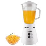 Licuadora con vaso de vidrio de 1.5 litros de capacidad, 2 velocidades + pulsador, sistema de ajuste del vaso a la base, 500 watts de potencia, base y tapa de color blanco.