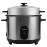 Olla arrocera de 1.8 litros de capacidad, vaporera exterior con tapa de vidrio, tazón con recubrimiento antiadherente, rinde 1.5 kilo de arroz, cuerpo de acero inoxidable, 700 watts.