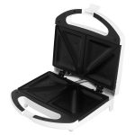 Sandwichera para pan partido, placas triangulares con revestimiento anti-adherente, asa termo-aislante de calor, luces indicadoras de funcionamiento, color blanco.