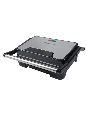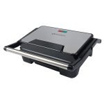 Mini grill con placas ranuradas y antiadherente para preparar sanguches, carnes, embutidos etc., asas termo-aislantes de calor, bandeja colectora de grasa, 750 watts.