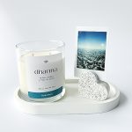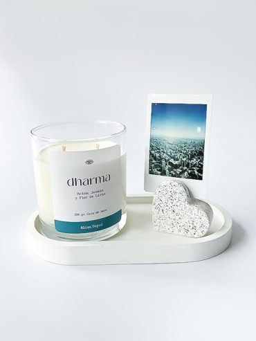 Marca: Bliss Yogui Contiene: Vela aromática ZEN (Mango, Pera y Durazno), Bandeja de concreto (18x 9.5 cm) y Budita de concreto(6.5x 3.5 cm).