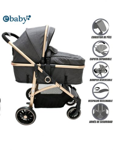 Se puede usar desde recién nacidos hasta los 3 años, tiene un marco 100% de aluminio, frenos de precisión en las llantas traseras, bloqueador de seguridad en las llantas traseras, mango telescópico regulable y un cubre pies sujetado con cierre, un bumper removible y el asiento se puede cambiar de dirección (viendo al camino o al padre) y capota expandible y con cierre para ver al bebé.