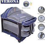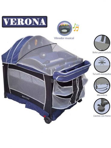 Cuna corral Mecedor Verona 6070 con 2 niveles . Incluye cambiador , capota completa de tul, organizador lateral, modulo musical y 2 ruedas para facilitar su traslado de un lugar a otro ambas con freno. Le da la comodidad y seguridad al bebé desde sus primeros dias de nacido en el primel nivel hasta los 9 kg aprox, que continuaria en el nivel como corralito hasta los 18 kg. Facil de plegar y práctico empaque en una funda maletin que le permite transportarlo si sale de viaje o paseo.
