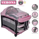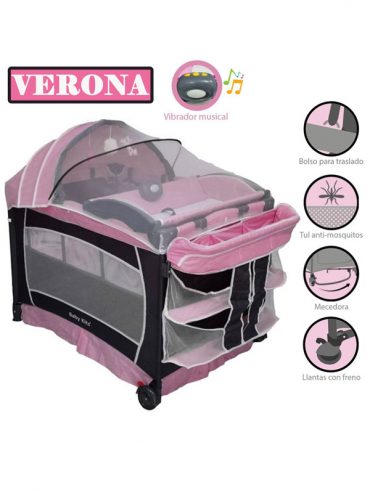 Cuna corral Mecedor Verona 6070 con 2 niveles . Incluye cambiador , capota completa de tul, organizador lateral, modulo musical y 2 ruedas para facilitar su traslado de un lugar a otro ambas con freno. Le da la comodidad y seguridad al bebé desde sus primeros dias de nacido en el primel nivel hasta los 9 kg aprox, que continuaria en el nivel como corralito hasta los 18 kg. Facil de plegar y práctico empaque en una funda maletin que le permite transportarlo si sale de viaje o paseo.