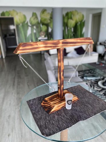 Juego dinámico, hecho de madera de pino, en el que cada vez que un jugador enceste el aro, mueve el vaso una pocisión hacia el lado del oponente. Gana quien logre empujar el vaso hasta el extremo contrario.