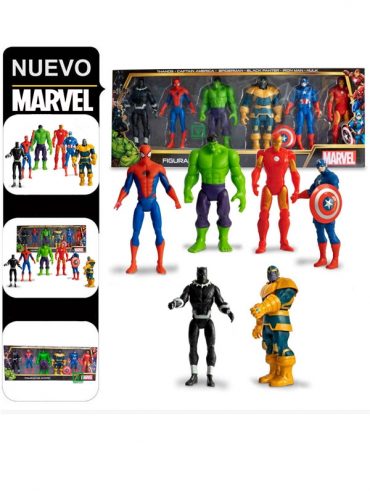 Incluye: Pantera Negra, Spiderman, Hulk, Thanos, Capitán América e Ironman + 1escudo