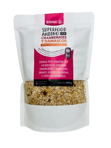 Ingredientes: Quinua pop, kiwicha pop, granos enteros de avena, cranberrys, damascos y especias naturales.